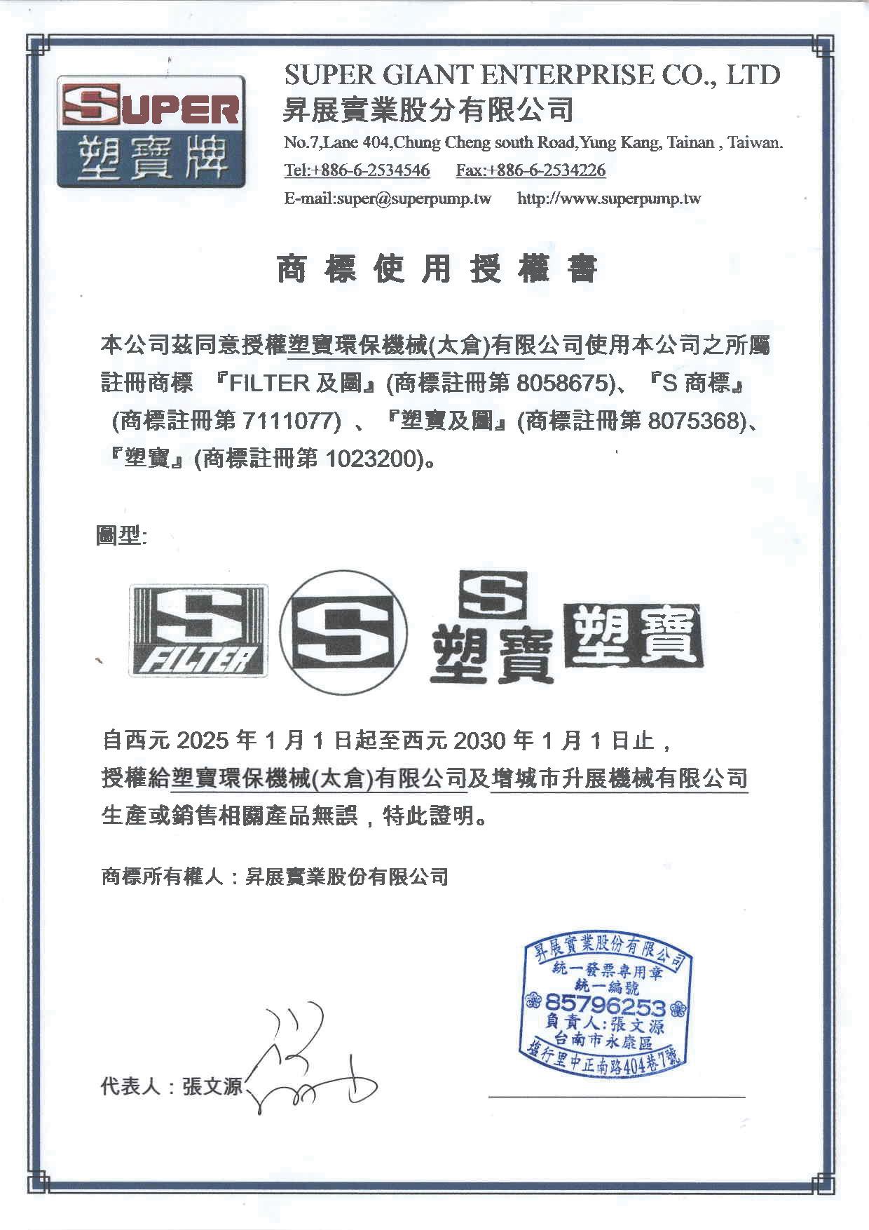 下列各式商標為本公司于大陸取得之商標注冊,僅授權太倉市塑寶環保機械及增城市升展機械公司使用,其余非經我司書面許可而濫用者,本公司將采取法律行動,追索侵權之損害賠償。
